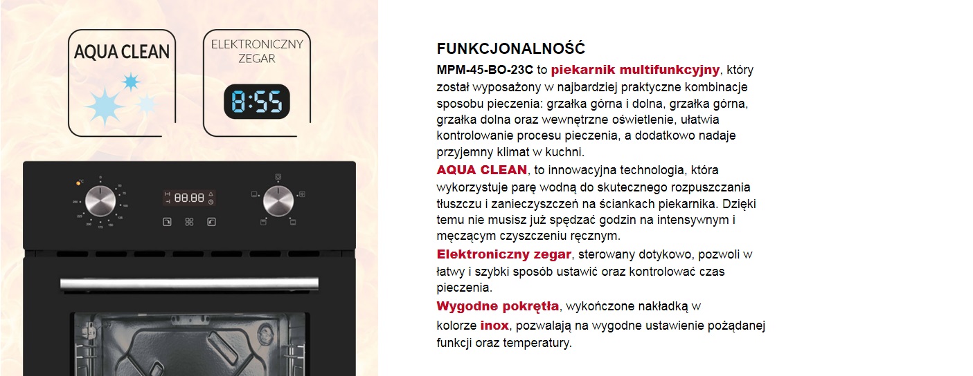 MPM-45-BO-23C to piekarnik multifunkcyjny, który został wyposażony w najbardziej praktyczne kombinacje sposobu pieczenia: grzałka górna i dolna, grzałka górna, grzałka dolna oraz wewnętrzne oświetlenie, ułatwia kontrolowanie procesu pieczenia, a dodatkowo nadaje przyjemny klimat w kuchni.